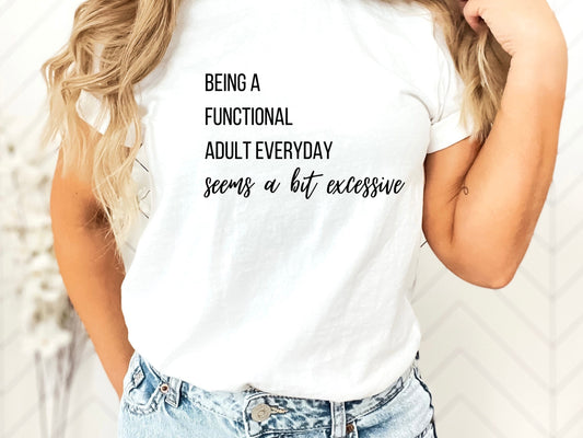 being a functional adult everyday seems a bit excessive, funny shirts, gifts for boss, adulting humor, sarcastic shirts, 18th birthday gifts